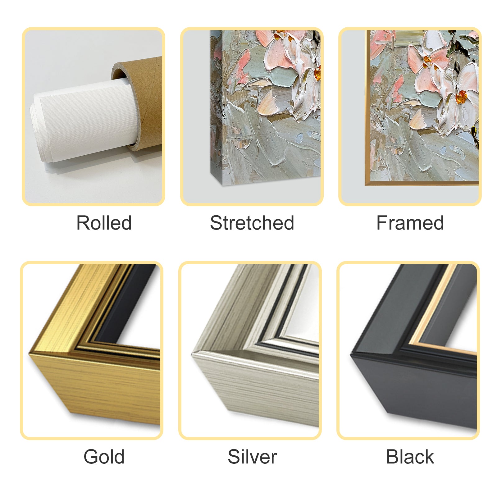 Hand-painted works are crafted by artists, so even with the same subject, each painting will have subtle variations, unique brushstrokes, and textures that cannot be duplicated. Prints are high-resolution reproductions of original paintings, offering sharp and consistent images that match the sample exactly.