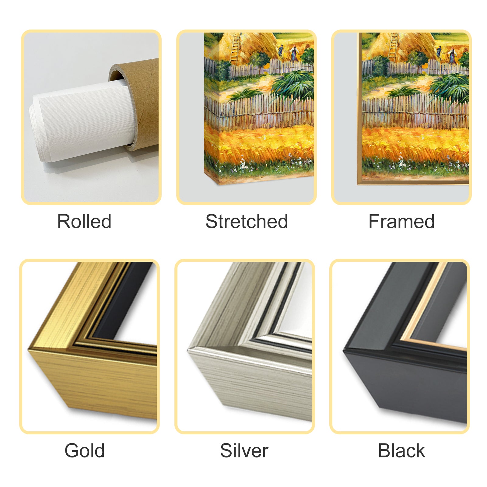 Hand-painted works are crafted by artists, so even with the same subject, each painting will have subtle variations, unique brushstrokes, and textures that cannot be duplicated. Prints are high-resolution reproductions of original paintings, offering sharp and consistent images that match the sample exactly.